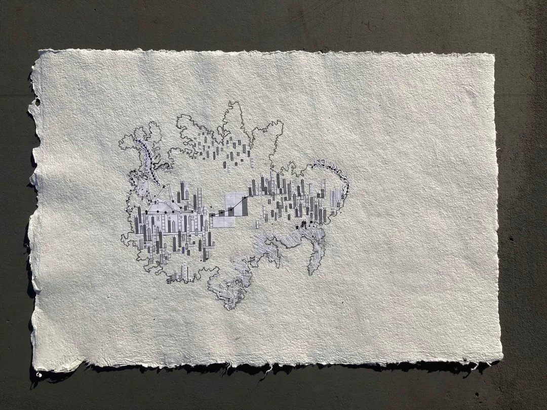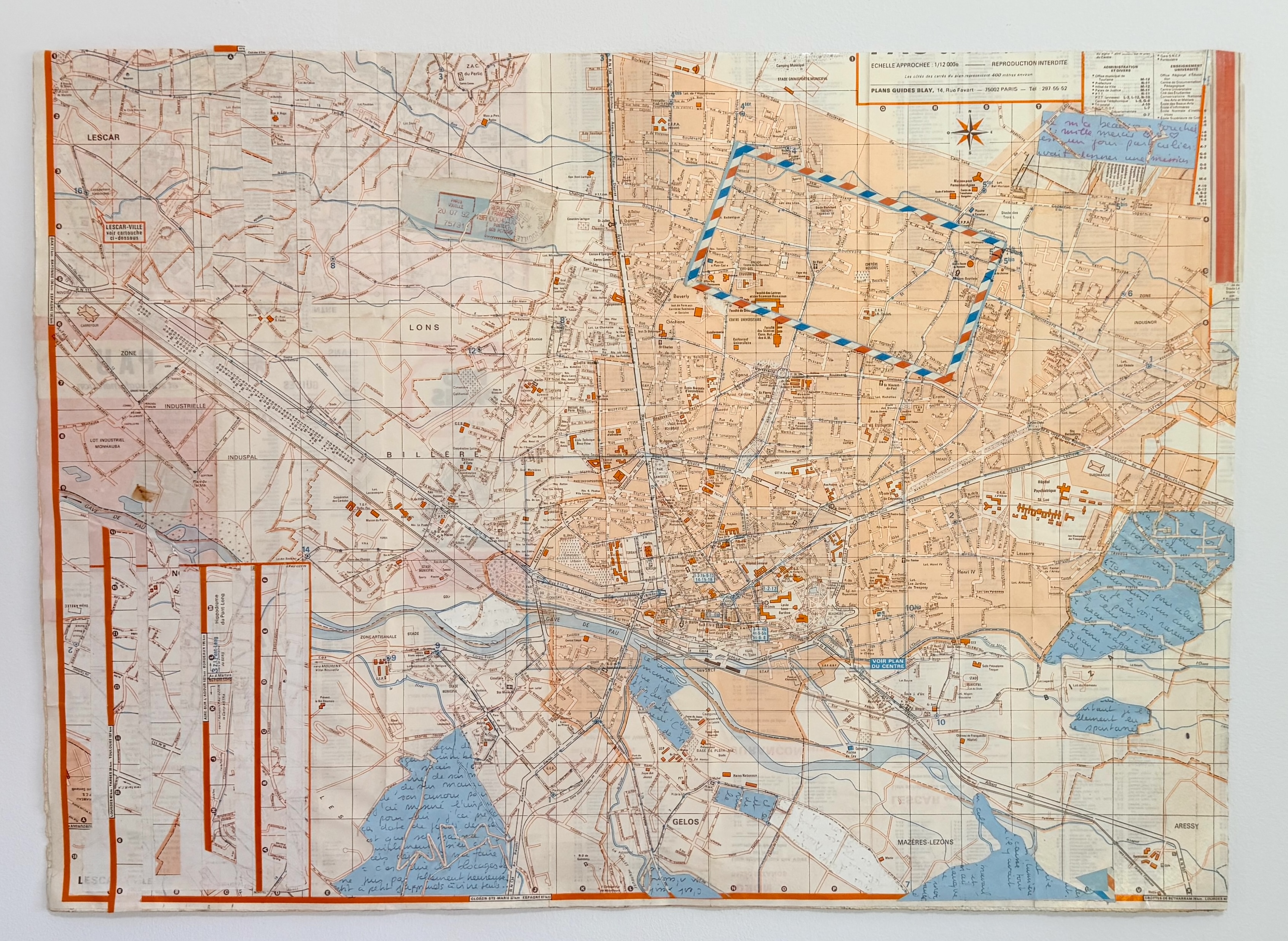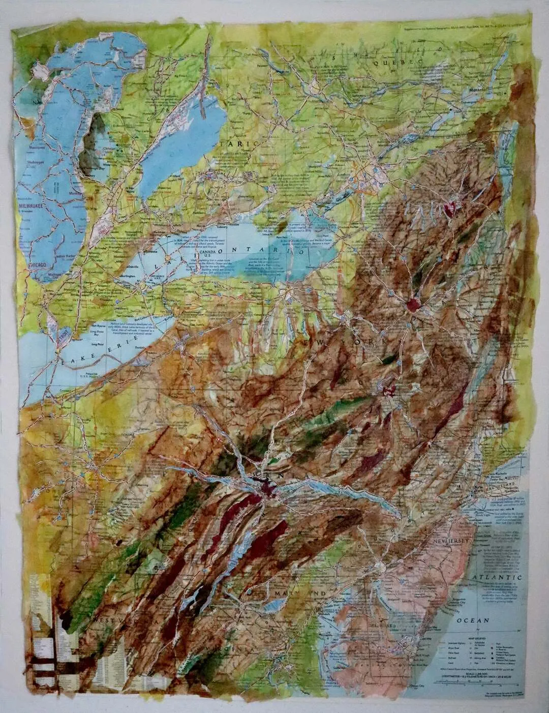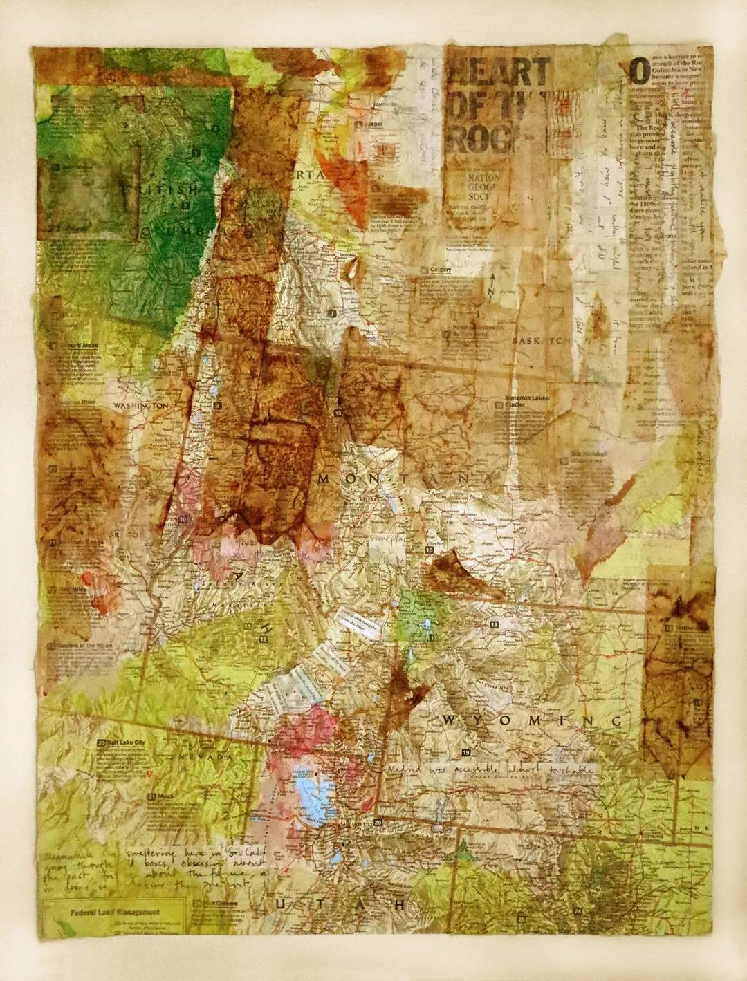 These mixed media works on paper are a continuation of the “Topographic Compilations” series, begun with cardboard reliefs cast in bronze in 2018. Using maps or graphic references of a place, each work begins with a process of free-association, connecting and layering real and imagined relationships in time and space. The collages are stories, open to interpretation, and I hope the viewer finds as much joy in the engagement with the visual and conceptual references as I do when making them.